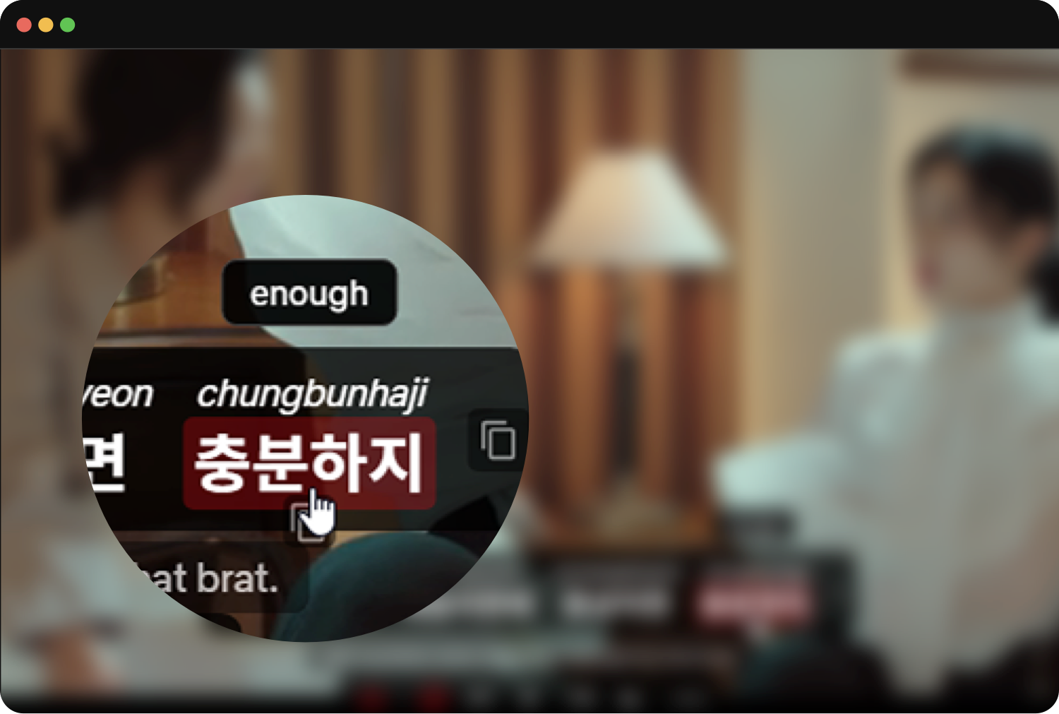 Hover over any word in the subtitles to instantly see its contextual translation. Quick, literal translations appear right where you need them β no interruption, no switching tabs. Just hover and understand.