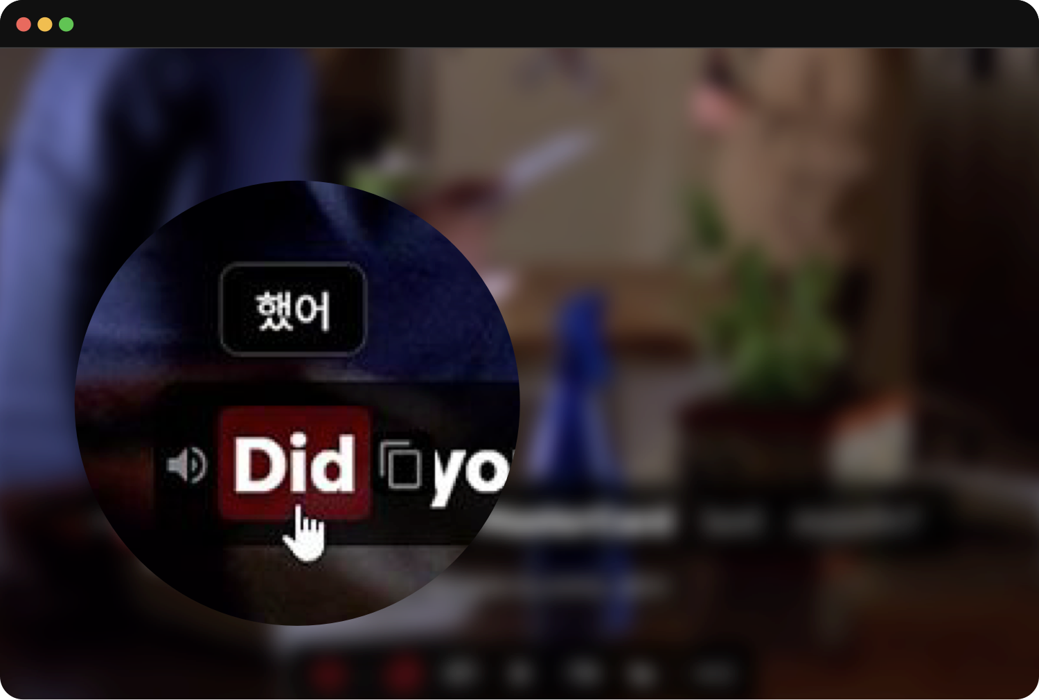 자막의 아무 단어 위에 마우스를 올리면 즉시 맥락에 맞는 번역을 볼 수 있습니다. 빠르고 직관적인 번역이 바로 그 자리에 나타납니다 — 중단도, 탭 전환도 없이. 호버만으로 이해하세요.